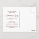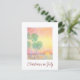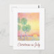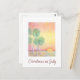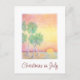 Noël en Juillet invitation carte postale avec typographie de script rouge et design de plage tropicale avec palmiers au coucher du soleil. Avec des lettres personnalisables en rouge, vous pouvez ajouter vos propres informations. Une façon festive d'ajouter une touche d'été à votre fête de vacances.