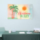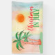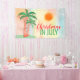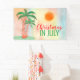 Fêtons Noël en juillet avec un barbecue ou une fête ! Famille Invitation et amis à votre fête de Noël et décorez-la avec cette bannière de style île avec des palmiers dessinés à la main et décorés de lumières sur un arrière - plan aquarelle. Dessin original © Michele Davies.