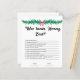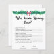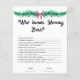 Le jeu de Baby shower "Who Knows Mommy Best" de Noël est une déviation festive sur un jeu de douche classique qui apporte la joie des vacances à votre événement. Décorée de branches de pin aux accents de Noël et de délicates touches rouges et vertes, cette carte de jeu permet aux clients de tester leurs connaissances sur la future maman avec des questions amusantes. Idéal pour les baby showers d'hiver, il ajoute une touche saisonnière à la célébration, créant une activité attrayante pour les invités à profiter pendant qu'ils se disputent des prix et en apprendre plus sur la mère attenante. Parfait pour un baby shower cosy et festif !