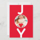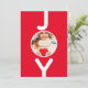 Une simple carte de Noël minimaliste et moderne en rouge et blanc. Sur le devant : Un arrière - plan rouge classique, avec le mot JOY écrit avec des lettres blanches en gras. La lettre O est utilisée comme cadre photo. Personnalisez et ajoutez votre propre photo de famille. Retour : arrière - plan rouge et texte blanc. Ajoutez vos propres salutations de vacances et nom(s) de famille. Les lettres dans le mot JOY comme décoration.