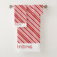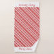 Sucre de canne motif rayé irrégulier avec alternance de rayures épaisses et fines en rouge et blanc. Les serviettes de bain et de la main sont recouvertes de rayures blanches à chaque fin de la journée avec Joyeux Noël en rouge qui peut être personnalisé avec votre propre message.