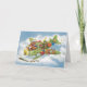 Carte de Noël facile à customiser ! Illustration vintage Voyage de Noël et conception de transport avec un joyeux Père Noël volant un avion à hélice à l'ancienne dans le ciel avec elfes, jouets, poupées, cadeaux emballés et un arbre de Noël sur l'aile. Ils volent à travers les nuages blancs et les étoiles au-dessus d'un village endormi couvert de neige en hiver.