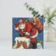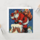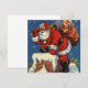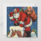 Illustration vintage de conception de vacances de Noël joyeux mettant en vedette un Père Noël jovial sur un toit enneigé descendant la cheminée avec un sac plein de jouets, des cadeaux emballés, des ours en peluche et des tambours la veille de Noël. Joyeuses Fêtes et Meilleurs Vœux!