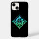 Un iPhone 14 Coque d'un bleu-vert Celtic noeud de conception diamant contre un arrière - plan noir.