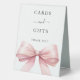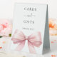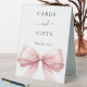 Fond blanc élégant, orné d'un grand nœud rose. Texte : Cartes et Cadeaux. Merci !