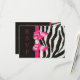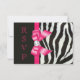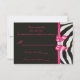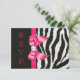 Cartes de réponse plates personnalisées imprimées sur le papier d'invitation de votre choix. Élégantes réponses personnalisées avec des rayures de zèbre noires et blanches et un ruban imprimé rose vif pour tout événement :- mariages, baby showers, bridal showers, fête d'anniversaire de femmes, sweet 16, célébrations de quinceañera, etc. avec un motif imprimé de rayures de fourrure d'animal zèbre noir et blanc, des images de rubans et de nœuds rose vif brillants, mignons et girly et des bijoux numériques jolis et clinquants sur fond noir avec un texte rose vif en cursive élégante. Veuillez noter : Toutes les invitations sur Zazzle ont des images imprimées plates. Ces cartes élégantes, à la mode, amusantes et glamour sont décorées/imprimées sur les deux côtés. Cartes personnalisées magnifiques, chic, tendance et modernes. Le texte, la police et la couleur de la police peuvent tous être personnalisés pour répondre à vos besoins. Si vous avez besoin
