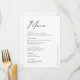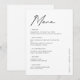 Vous recherchez un menu de table mariage ? Voici notre superbe Black White Modern Typography Mariage Table Menu! Ce menu mariage simple exhale un raffinement intemporel avec son élégante typographie moderne et son design épuré et minimaliste. C'est le choix idéal pour les couples à la recherche d'invitations de mariage sobres mais élégantes qui captent l'essence d'un élégant thème mariage moderne.