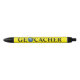 Ce stylo personnalisable indique GEOCACHER. La lettre O est une image de la terre avec les drapeaux geocaching.
