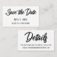 Gardez vos invités mariages en boucle avec tous vos détails grâce à ces jolies cartes d'insertion de mariage complètes. Ces jolies cartes reflètent un style élégant et décontracté. Les superpositions de texte élégantes ont été conçues à l'aide d'une police de script moderne, audacieuse et décontractée en noir. L'un des côtés dit "Sauvez la Date" et l'autre, simplement "Détails". Utilisez les champs modèles pour customiser ces cartes de boîtier avec vos informations personnelles. Imprimé à l'aide de la "technologie carte de visite", la taille pratique sera facile à garder à portée de main. Envoyez-les avec vos envois traditionnels, et gardez-en quelques-uns pour les partager avec ceux qui en ont besoin d'un ou deux de plus ! Le arrière - plan est blanc et cette couleur modifiable peut être changée en n'importe quoi dans la palette de mariages que vous choisissez ; tout le texte modifiable apparaît en noir. // 89 // Conçu par Melody Watson pour Paper Muserie.