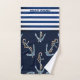Cette image présente un nom de bateau et des ancres sur un arrière - plan rayé bleu et blanc de la marine.