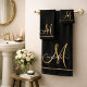 Ensemble de serviettes de salle de bain personnalisées avec nom de monogramme noir élégant en or avec bordures dorées. Renouvelez votre décoration de salle de bain avec un style typographique minimaliste.