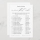 Présentation de l'Elegant Nom That Cake Fête des mariées Game Card - l'ajout parfait à vos festivités de douche nuptiale! Ce jeu engageant fera bourdonner d'excitation à vos invités en essayant d'assortir des indices au type de gâteau décrit. Qu'il s'agisse d'une douche nuptiale, d'un wedding shower ou d'une occasion spéciale, ce jeu personnalisable est un coup de surefire ! Avec son design minimaliste noir et blanc, la Elegant Name That Cake Fête des mariées Game Card dégage élégance et raffinement. Il ne se limite pas aux douches nuptiales, il peut aussi être joué lors de baby showers, de bachelorettes et même de fêtes d'anniversaire pour enfants. Les possibilités sont infinies. Le jeu peut être joué individuellement ou en petites équipes, ajoutant un élément de compétition amicale à votre événement. Le premier joueur ou l'équipe à égaler toutes les réponses correctement gagne ! Sa polyvalence et sa simplicité en font un établissement adapté à tous les âges et arrière - plans. Conçu avec soin, cette carte de jeu garantit une expérience sans faille et agréable pour tous les participants. Sa fonctionnalité personnalisable vous permet d'ajouter votre touche personnelle, ce qui en fait une touche unique et mémorable. Alors pourquoi attendre ? Obtenez le nom élégant That Cake Fête des mariées Game Card aujourd'hui et créez des moments inoubliables remplis de rire et de joie. Laissez les jeux de devinettes commencer !
