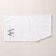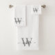 Ensemble de serviettes de bain personnalisées élégantes et féminines, blanches et grises, avec monogramme, initiale, nom, signature et écriture moderne. Caractérisé par un prénom (ou nom de famille) dans une jolie typographie de style lettrage manuscrit avec queue en arabesque (ou calligraphie) avec monogramme initial gris et noir sur fond blanc. Cadeau de pendaison de crémaillère élégant et féminin, également pour un anniversaire, un mariage, une douche de mariée, une soirée entre filles, une fête d'anniversaire pour les 16 ans, la fête des mères, un cadeau d'anniversaire de mariage et pour une fête de remise de diplôme, et c'est pour la fille qui aime les choses élégantes et stylées.