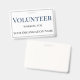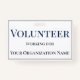 Ce badge d'identification comporte le titre "Volontaire" imprimé en gros caractères bleus près du haut de l'insigne. Le texte suivant contient les renseignements sur les bénévoles ou les employés et le nom de l'entreprise ou de l'organisation. L'insigne d'identification volontaire est bordé d'un simple cadre gris.