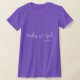 Le t-shirt féminin est présenté dans un style à col d'équipage et à manches courtes en violet avec un texte en couleur blanche : Mère de la mariée et un nom d'échantillon personnalisé. Customisez cet article et changez le nom de l'échantillon à votre nom ou achetez tel quel.