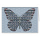 The wings and body of a monarch butterfly are decorated with designs inspired by patterns on sweaters found in the Nordic countries of Norway, Sweden, and Finland, with motifs like snowflakes, mountains, and evergreen trees in white, blue, green, and gray with bright red accents.
