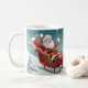 Santa Claus and his reindeer soaring over a peaceful, snow-covered winter village.