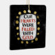 Un design typographique mignon qui dit "Nos Coeurs Étaient Remplies D'Or". C'est du texte en noir et rouge sur un rectangle blanc avec des points d'or amusants et amusants qui l'entourent, le tout sur un arrière - plan noir.
