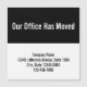 "Notre bureau a déménagé" est en gros texte blanc en haut. Quatre lignes de texte noir sont en bas. Vous pouvez modifier le texte pour afficher le nom, l'adresse et le numéro de téléphone de votre société.