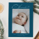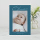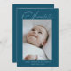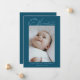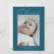 Elégante carte de faire-part de naissance de Noël avec typographie qui dit "notre miracle de vacances" avec un coeur. C'est une carte faire-part de naissance pour les saisons de vacances ! Ajoutez vos photos, vos statistiques de naissance et un message ! La photo verticale fonctionne le mieux à l'avant. L'arrière - plan est turquoise.