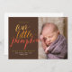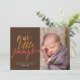Ce faire-part de naissance bébé à thème Halloween/automne comporte les mots "notre petit citrouille" dans la typographie de script moderne en couleurs d'automne sur un arrière - plan marron. Les détails de naissance de votre bébé sont affichés en dessous et sa photo se trouve à droite. Photographie © Storytree Studios, Stanford, CA