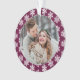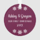 Cet ornement moderne de souvenir de vacances présente une photo du couple nouvellement marié sur le devant encadrée par une couleur de bordure bordeaux / rouge vin avec un motif contrasté de flocons de neige blancs hivernaux. L'arrière du design comprend la même palette de couleurs avec le texte "Notre Premier Noël" et un monogramme personnalisé de leurs noms et de l'année de leur mariage.