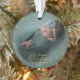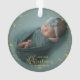 L'ornement photo de Noël personnalisable pour les nouveau-nés présente une photo de bébé préférée de chaque côté, avec "Notre premier Noël" élégamment revêtu de calligraphie dorée. Personnalisez-le avec le nom et la date de votre bébé.