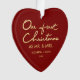 Marié récemment ! Commémorez votre premier Noël de mariage avec ce magnifique ornement de Noël en forme de coeur. Le design présente " Our First Christmas " dans une police de faux or magnifiquement lettrée à la main sur un arrière - plan rouge profond. Personnalisez l'ornement en remplaçant les noms d'échantillons et l'année. D'autres styles et produits de correspondance tels que cartes photos de vacances, timbres-poste, papier d'emballage cadeau, etc. sont également disponibles dans notre boutique. Veuillez contacter directement le concepteur si vous avez des demandes de personnalisation de la conception.