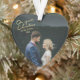 Un cadeau de Noël mémorable pour les jeunes mariés. Envoyez cette belle photo en forme de coeur Noël aux jeunes mariés pour commémorer leur mariage, pour leur premier Noël, comme M. et Mme L'ornement présente "Notre premier Noël" dans une belle police en fausse feuille d'or en lettres manuscrites avec espace pour une photo. Personnalisez l'ornement en remplaçant la photo et l'année. Pour obtenir de meilleurs résultats, utilisez une photo qui est recadrée à une forme carré. D'autres styles et des produits de correspondance tels que cartes de fin de année photo, timbres-poste, papier d'emballage cadeau, etc. sont également disponibles dans notre magasin.
