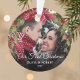 Notre premier ornement de noël arboré avec une photo sur les deux côtés, une couronne d'aquarelle xmas et un modèle de texte personnalisé.