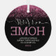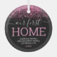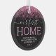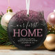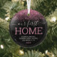 Nouveau décor de Noël en verre de maison avec un arrière - plan noir tendance, une élégante cascade en parties scintillant rose, le mignon dicton "notre première maison", votre nom, votre nouvelle adresse et l'année.