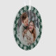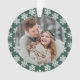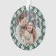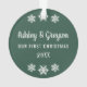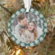Cet ornement moderne de gardiens de vacances présente une photo du couple marié sur le devant encadré par une couleur de bordure vert foncé avec un motif contrastant de flocons de neige blancs d'hiver. Le dos de la conception comprend le même jeu de couleurs avec le libellé "Notre premier Noël" et un monogramme personnalisé de leurs noms et l'année où ils ont été mariés.