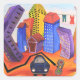Un tableau coloré, amusant et imaginatif représentant quelqu'un dans une voiture quittant une ville avec des immeubles tordus.