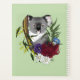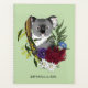 Cette charmante illustration présente un adorable ours koala qui regarde hors d'un bouquet de vibrante flore native australienne. Entouré de feuilles luxuriantes d'eucalyptus, de fleurs d'acacia dorées, de délicates marguerites et de fleurs audacieuses de style protea, l'expression douce du koala ajoute de la chaleur et de la personnalité à la composition. Le fond vert sauge doux renforce l'aspect naturel et botanique, ce qui rend ce design parfait pour les amoureux de la nature, les passionnés de la faune et tous ceux qui sont attirés par une œuvre d'art fantaisiste et élégante.
