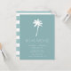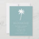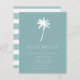 Faire-part tropicale mobile avec un palmier sur un arrière - plan bleu avec un dos rayé frais et moderne.