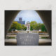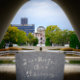 L'image montre le cénotaphe mémorial dans le parc commémoratif de la paix d'Hiroshima avec l'inscription 'Que toutes les âmes ici reposent en paix, car nous ne répéterons pas l'erreur.'