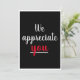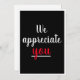 Une carte décontractée "Nous vous apprécions". Carte d'appréciation rouge et blanc que vous pouvez rendre personnelle avec un beau geste du patron de l'entreprise, des collègues ou n'importe qui. Il vous suffit d'utiliser la fonction "personnaliser ce modèle" pour modifier le texte afin de le rendre le vôtre. Autres styles de papier disponibles.