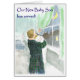 Une nouvelle carte de faire-part pour bébé avec un père tenant un nouveau bébé au milieu de la nuit, regardant la lune par la fenêtre ; d'une aquarelle de Judy Adamson. L'option la moins chère d'utiliser ce design sur une carte postale est disponible.