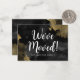 Une carte de faire-part émouvante. Faites savoir à vos amis et à votre famille que "nous avons déménagé" et changez d'adresse. Une élégante aquarelle noire et fausse or ou encre d'alcool. Un look simple et moderne pour une ambiance élégante et design. Une élégante typographie de calligraphie de script pour le que nous avons déplacé, et une simple police moderne pour le contraster. Aussi disponible en d'autres teintes métalliques.