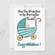 Nouvelle déduction fiscale dans votre famille. Customisez avec le nom de la nouvelle famille. Adorable nouvelle carte de félicitations pour bébé. Chariot de bébé coloré avec une petite tête d'aile qui regarde dehors. Sexe neutre avec bandes de couleurs turquoises. Nouvelle déduction fiscale dans la famille [nom personnalisable] en police de caractères amusants avec "Félicitations! écrite en couleur correspondante sous le chariot. Texte sorti avec une légère ombre portée. Place au dos pour ajouter votre propre message ou supprimer le texte qui est là.