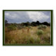 Les nuages de tempête se rassemblent au-dessus d'un champ avec une variété d'herbes et d'arbustes.