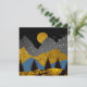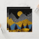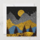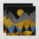Paysage montagnard Abstrait dans des tons audacieux d'or, noir et bleu avec un lever de lune et des oiseaux.