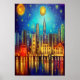 Art coloré d'une ville au bord du lac dans la nuit, de nombreuses étoiles et deux lunes dans le ciel, skyline fantaisie avec petit bâtiment et gratte-ciel. C'est un art généré par l'IA.