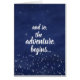 Simple pourtant perfectionnez pour de nouveaux événements de beggings comme des obtentions du diplôme, nouveau bébé, ou les nouveaux mariés, ce ciel nocturne étoilé bleu et blanc "et ainsi, l'aventure commencent" la carte de voeux sont la manière parfaite d'offrir des mots d'encouragement et d'amour. La typographie intérieure peut être changée en votre dire désiré ou la suppression à remettre écrivent votre propre message spécial.