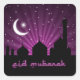 Illustration de salutation d'Eid avec des silhouettes de la lune, des étoiles et d'une mosquée sur un ciel nocturne pourpre.