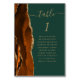 Le bord gauche de cette élégante carte de numéro de table mariage moderne comporte une bordure d'aquarelle couleur orange brûlée et rouille, ornée d'une parties scintillant en faux or. Le mot "table" apparaît dans un script d'écriture manuscrite de couleur or sur un arrière - plan vert foncé. Ajoutez les noms de vos invités qui sont affectés à chaque table.