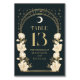 Elevez votre événement avec élégance ! Ces cartes de table Art Nouveau sont ornées d'arcs dorés, d'étoiles chatoyantes et de fleurs blanches délicates sur fond bleu profond, un design intemporel pour les mariages, les dîners ou les célébrations. Ajoutez aujourd'hui une touche de charme vintage à votre décor de table ! Veuillez noter que l'or sur ce produit n'est PAS du papier d'aluminium réel ; il est imprimé à plat. Les articles sont imprimés exactement comme ils apparaissent sur votre écran lorsque vous ajoutez au panier, donc personnalisez et ajoutez chaque numéro de table dont vous avez besoin à votre panier individuellement.