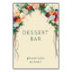 Ce panneau de table de mariage présente un charmant design d'arche florale avec un ensemble de fleurs et de feuillages colorés, créant une atmosphère vibrante et invitante. La disposition est équilibrée, avec le texte "DESSERT BAR" affiché en évidence dans une police serif, suivi de "please take a treat !" dans un style sans-serif plus simple, les deux dans une couleur sarcelle atténuée qui contraste magnifiquement avec le fond crème. La technique d'illustration numérique lui donne un aspect soigné et moderne, parfait pour ajouter une touche d'élégance à votre célébration. Idéal pour les mariages ou les rassemblements festifs, ce panneau crée une ambiance joyeuse et accueillante, encourageant les invités à se régaler de friandises.