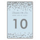 Design élégant "Table Number" avec Silver Faux Parties scintillant Confetti Ice Blue et texte de numéro de table personnalisé.