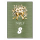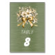 Carte de numéro de table dans la belle collection de fleurs de baie d'hiver blanche, feuilles vertes et ruban doré.